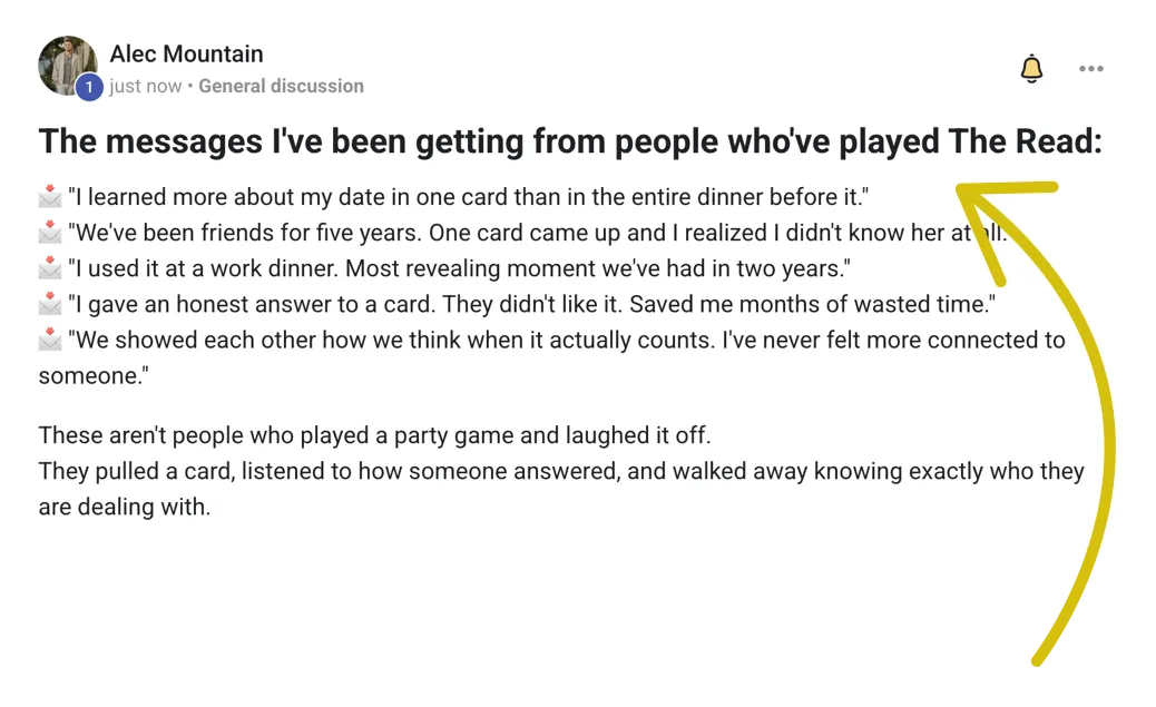 → You bring it to a dinner with people you’ve known for years. Someone answers a card and the table goes quiet. It turns into the most honest conversation you’ve ever had together.